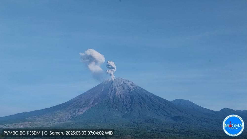 CARAPANDANG - Gunung Semeru di perbatasan Kabupaten Malang dan Kabupaten Lumajang mengalami erupsi pada pukul 07.02 WIB, Sabtu (3/5/2025). Tinggi kolom letusan kurang lebih 700 meter di atas puncak gunung atau 4376 meter di atas permukaan laut.