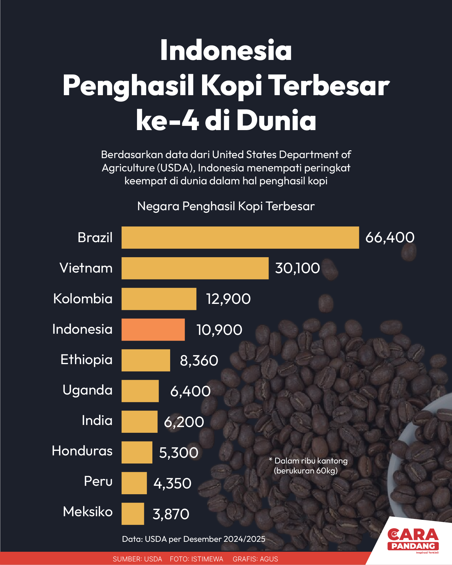 CARAPANDANG - Indonesia merupakan salah satu negara produsen kopi terbesar di dunia. Menurut data dari United States Department of Agriculture (USDA), produksi kopi Indonesia pada tahun 2024 diperkirakan mencapai 10,90 juta karung. Angka ini menempatkan Indonesia sebagai produsen kopi terbesar ke-4 di dunia.