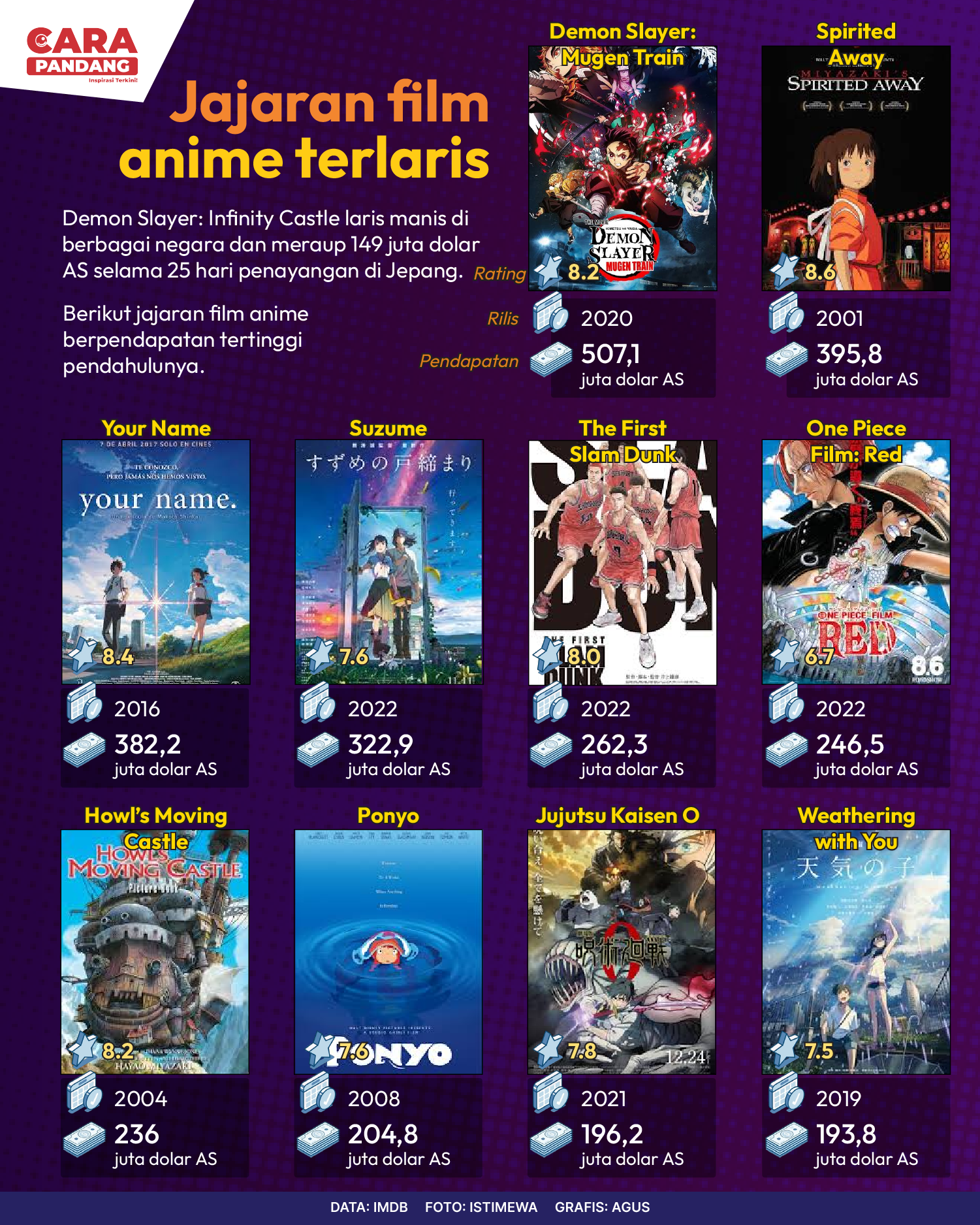 Beranda Infografis Jajaran Film Anime Terlaris Infografis Jajaran Film Anime Terlaris Jajaran Film Anime Terlaris. Penulis Zoel Rachman - 22 Agustus 2025 06:50 0 CARAPANDANG.COM - Jajaran Film Anime Terlaris. Tags Infografik Anime Berita Sebelumnya Hari Ini, KPK Panggil Lisa Mariana dan Umumkan Status Wamenaker Berita Berikutnya Gubernur Mahyeldi Buka Musda VI ASPADIN Sumbar: Kelola Air Secara Bijak, Jaga Alam untuk Generasi Mendatang LEAVE A REPLY Cancel reply Comment: Please enter your comment! Name:* Please enter your name here Email:* You have entered an incorrect email address! Please enter your email address here Website: Save my name, email, and website in this browser for the next time I comment. Berita Teratas Netflix Akan Hadirkan Sekuel 'Peaky Blinders' Taylor Swift Umumkan Jadwal Pemutaran Film 'Showgirl' FIFA Luncurkan Trionda, Bola Resmi Piala Dunia 2026 Google Siapkan Tampilan Terbaru Gemini Implementasi G7KAIH, Role Model Pembiasaan Karakter di Satuan Pendidikan Jawa Tengah Berita Terkait Berita Terkait Seragam Baru TNI Maliq - 08 Oktober 2025 10:01 Narasi Subsidi Bahlul vs Purbaya Maliq - 07 Oktober 2025 09:55 Operator BBM Swasta Urung Beli dari Pertamina Maliq - 05 Oktober 2025 06:31 Shell Update Harga, Netizen Lapang Dada Maliq - 04 Oktober 2025 07:50