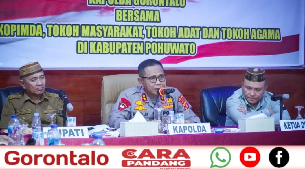 POHUWATO, CARAPANDANG - Dalam upaya menjaga keamanan dan kondusifitas di Kabupaten Pohuwato menjelang Bulan Suci Ramadhan dan Idul Fitri 2025, Kapolda Gorontalo, Irjen Pol. Drs. Pudji Prasetijanto Hadi, M.H., menggelar kegiatan tatap muka bersama Forkopimda dan tokoh masyarakat di Aula Tribrata Polres Pohuwato, Selasa 11 Februari 2025.