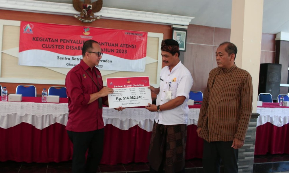 CARAPANDANG - Kementerian Sosial melalui Sentra “Satria” di Baturraden menyelenggarakan kegiatan Penyaluran Bantuan Atensi Klaster Disabilitas Tahun 2023 di Kabupaten Cilacap, Prov. Jawa Tengah.