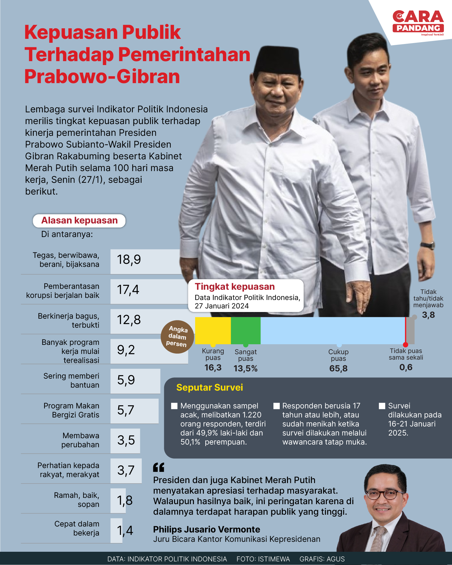 Beranda Infografis Kepuasan Publik Terhadap Pemerintahan Prabowo-Gibran Infografis Kepuasan Publik Terhadap Pemerintahan Prabowo-Gibran Penulis Amira Izzati - 31 Januari 2025 09:20 0 CARAPANDANG - Kepuasan Publik Terhadap Pemerintahan Prabowo-Gibran Tags Berita Sebelumnya Dubes Romania Temui Gubernur Sumbar untuk Membahas Sejumlah Rencana Kerjasama Berita Berikutnya Mediator Sebut Draf Final Kesepakatan Gencatan Senjata Gaza sedang Disusun LEAVE A REPLY Cancel reply Comment: Please enter your comment! Name:* Please enter your name here Email:* You have entered an incorrect email address! Please enter your email address here Website: Save my name, email, and website in this browser for the next time I comment. Berita Teratas Netflix Akan Hadirkan Sekuel 'Peaky Blinders' Taylor Swift Umumkan Jadwal Pemutaran Film 'Showgirl' FIFA Luncurkan Trionda, Bola Resmi Piala Dunia 2026 Google Siapkan Tampilan Terbaru Gemini Implementasi G7KAIH, Role Model Pembiasaan Karakter di Satuan Pendidikan Jawa Tengah Berita Terkait Berita Terkait Seragam Baru TNI Maliq - 08 Oktober 2025 10:01 Narasi Subsidi Bahlul vs Purbaya Maliq - 07 Oktober 2025 09:55 Operator BBM Swasta Urung Beli dari Pertamina Maliq - 05 Oktober 2025 06:31 Shell Update Harga, Netizen Lapang Dada Maliq - 04 Oktober 2025 07:50
