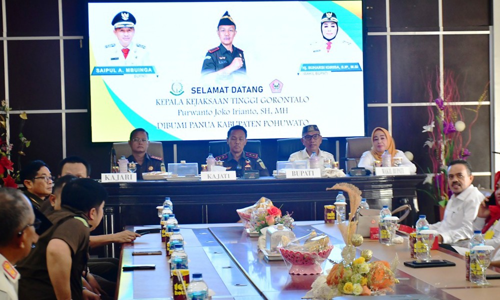 POHUWATO, CARAPANDANG.COM - Bupati Pohuwato, Saipul A. Mbuinga menyambut baik kunjungan Kepala Kejaksaan Tinggi (Kajati) Gorontalo di Kabupaten Pohuwato, dimana pada hari kedua setelah diterima secara adat Selasa kemarin, Kajati Gorontalo, Purwanto Joko Irianto,S.H.,M.H melakukan pertemuan dengan jajaran pemerintah daerah hingga camat dan kepala desa.