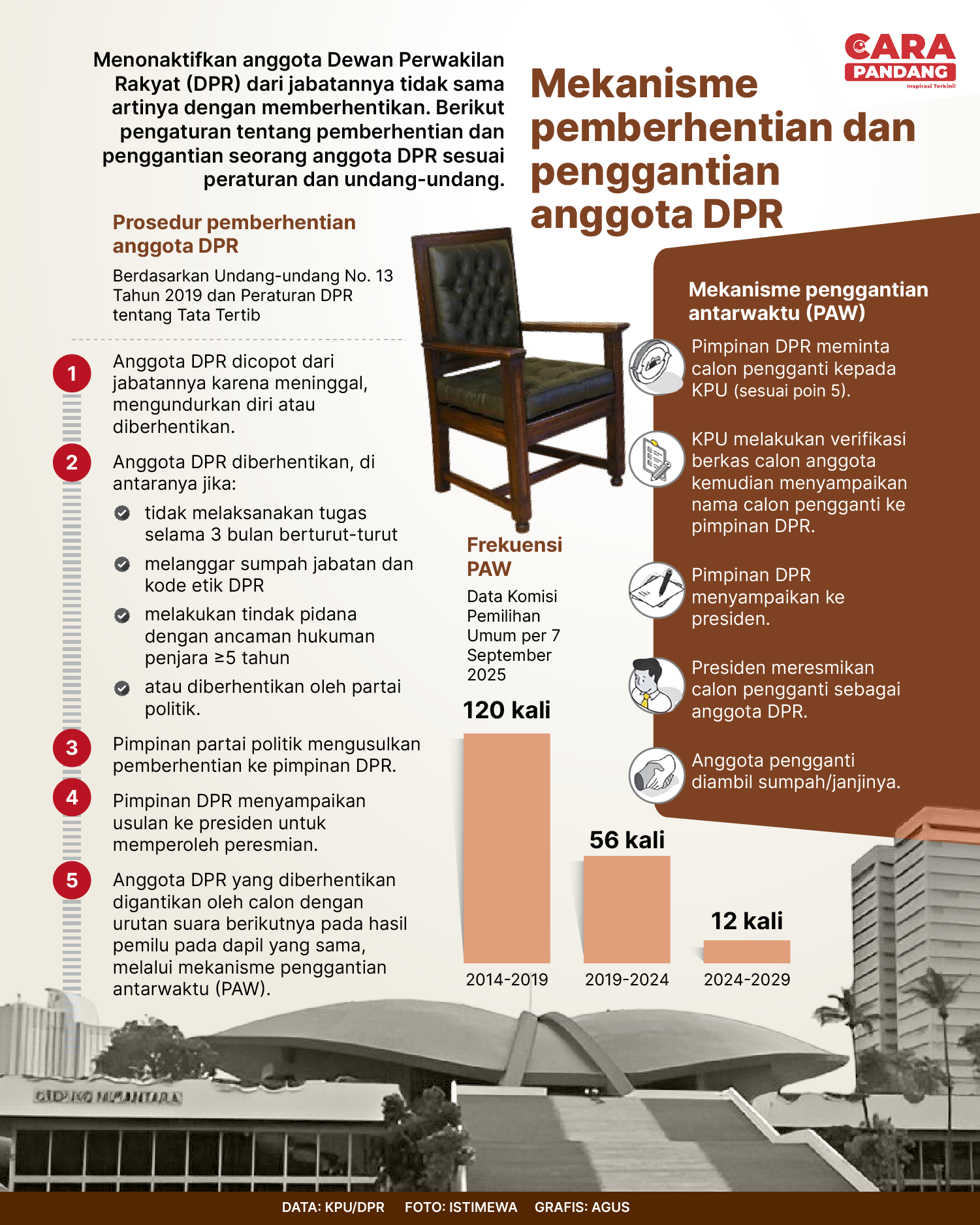 Beranda Infografis Mekanisme Pemberhentian dan Penggantian Anggota DPR Infografis Mekanisme Pemberhentian dan Penggantian Anggota DPR Penulis Amira Izzati - 10 September 2025 14:13 0 Mekanisme Pemberhentian dan Penggantian Anggota DPR Tags Berita Sebelumnya Bupati dan Wabup Pohuwato Lepas 10 Ekor Burung Maleo di Kawasan Cagar Alam Berita Berikutnya Sekjen PBB Serukan Israel-Hamas Patuhi Sepenuhnya Rencana Perdamaian LEAVE A REPLY Cancel reply Comment: Please enter your comment! Name:* Please enter your name here Email:* You have entered an incorrect email address! Please enter your email address here Website: Save my name, email, and website in this browser for the next time I comment. Berita Teratas Netflix Akan Hadirkan Sekuel 'Peaky Blinders' Taylor Swift Umumkan Jadwal Pemutaran Film 'Showgirl' FIFA Luncurkan Trionda, Bola Resmi Piala Dunia 2026 Google Siapkan Tampilan Terbaru Gemini Implementasi G7KAIH, Role Model Pembiasaan Karakter di Satuan Pendidikan Jawa Tengah Berita Terkait Berita Terkait Seragam Baru TNI Maliq - 08 Oktober 2025 10:01 Narasi Subsidi Bahlul vs Purbaya Maliq - 07 Oktober 2025 09:55 Operator BBM Swasta Urung Beli dari Pertamina Maliq - 05 Oktober 2025 06:31 Shell Update Harga, Netizen Lapang Dada Maliq - 04 Oktober 2025 07:50