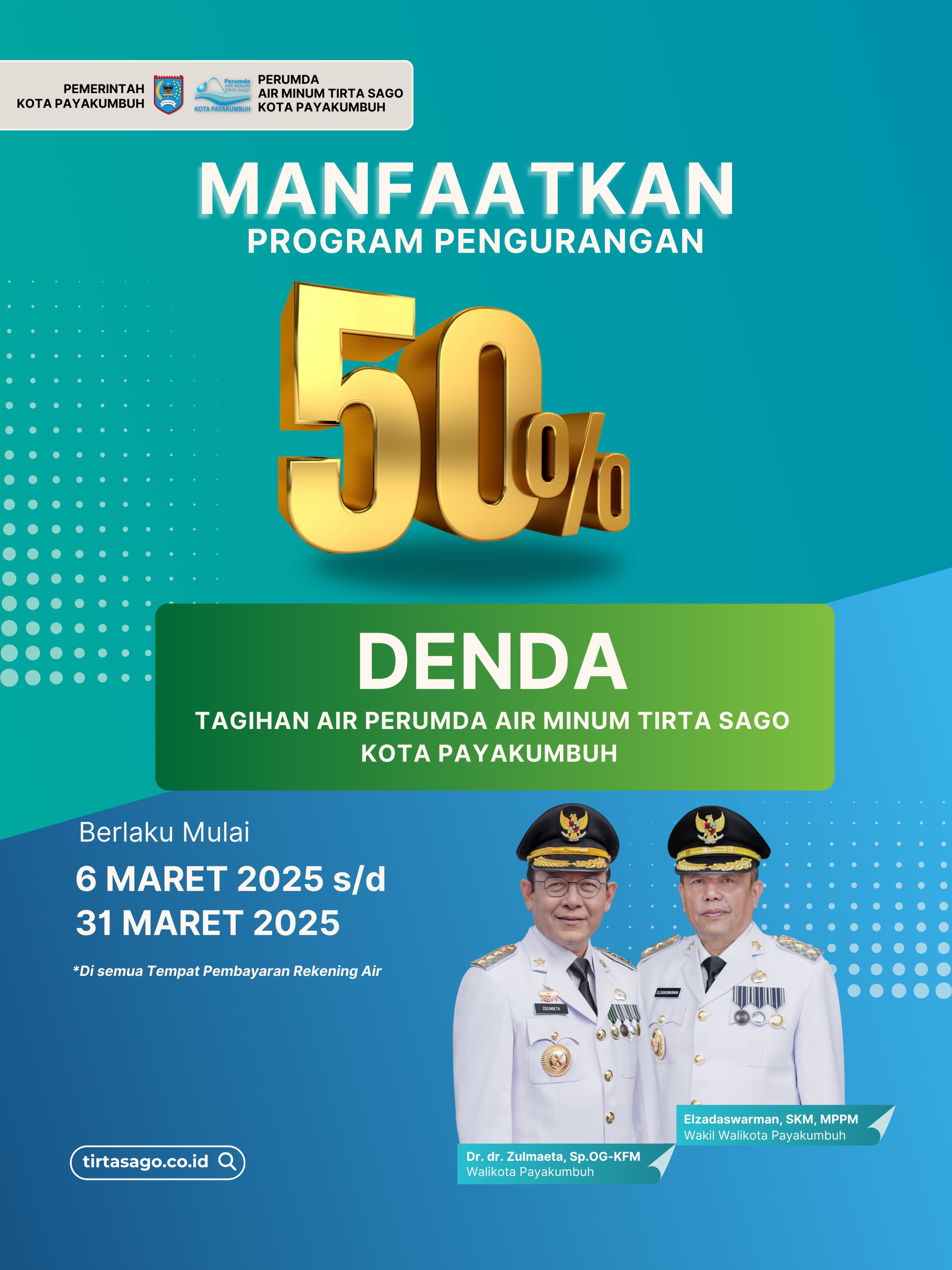 Perumda Air Minum Tirta Sago (Pamtigo) Kota Payakumbuh memberikan keringanan denda keterlambatan pembayaran hingga 50 persen.