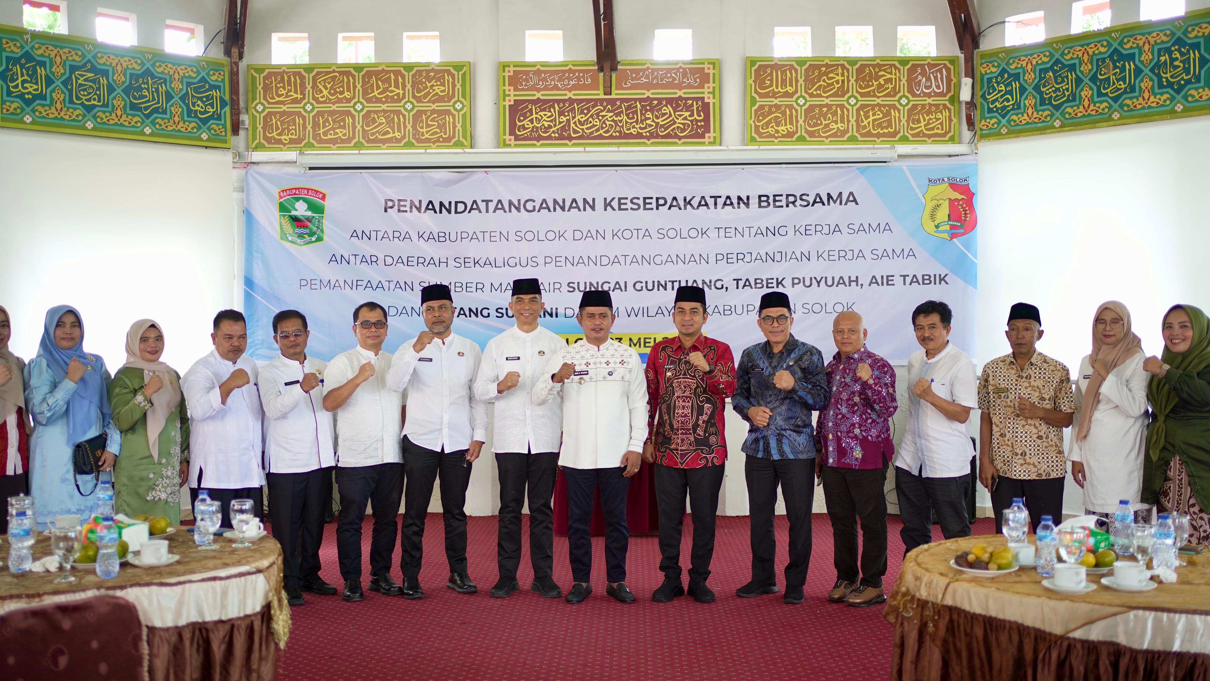 SOLOK, CARAPANDANG - Pemerintah Kabupaten Solok dan Pemerintah Kota Solok resmi menandatangani Kesepakatan tentang Kerja Sama Antar Daerah, sekaligus Perjanjian Kerja Sama Pemanfaatan Sumber Mata Air Sungai Gantuang, Tabek Puyuah, Aie Tabik, dan Batang Sumani, pada Jumat (23/05/2025). Penandatanganan berlangsung di Balairung Rumah Dinas Wali Kota Solok.