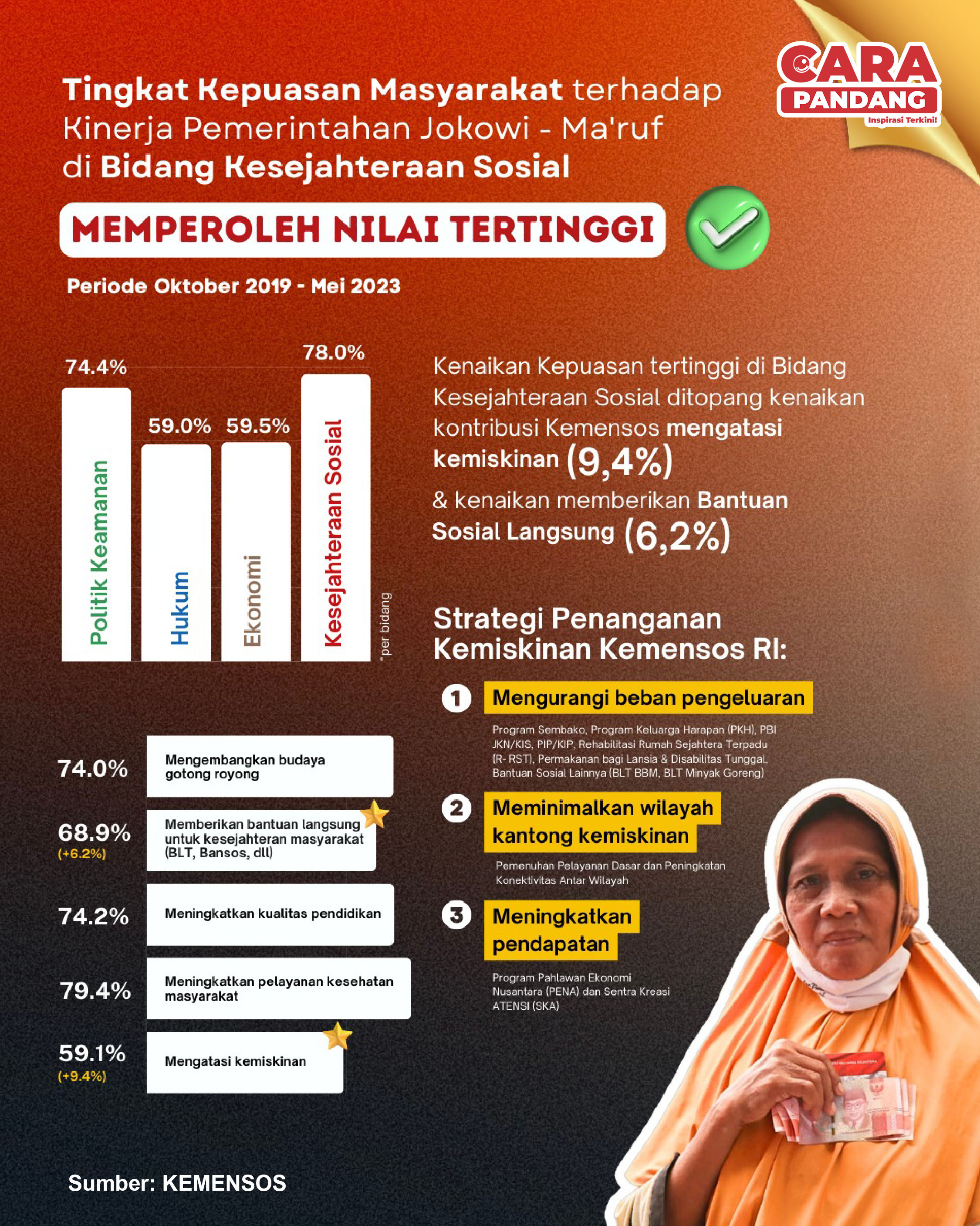 CARAPANDANG - Kenaikan kepuasaan tertinggi di Bidang Kesejahteraan Sosial ditopang kenaikan Kemensos mengatasi kemiskinan (9,4%) dan kenaikan memberikan bantuan sosial langsung (6,2%).