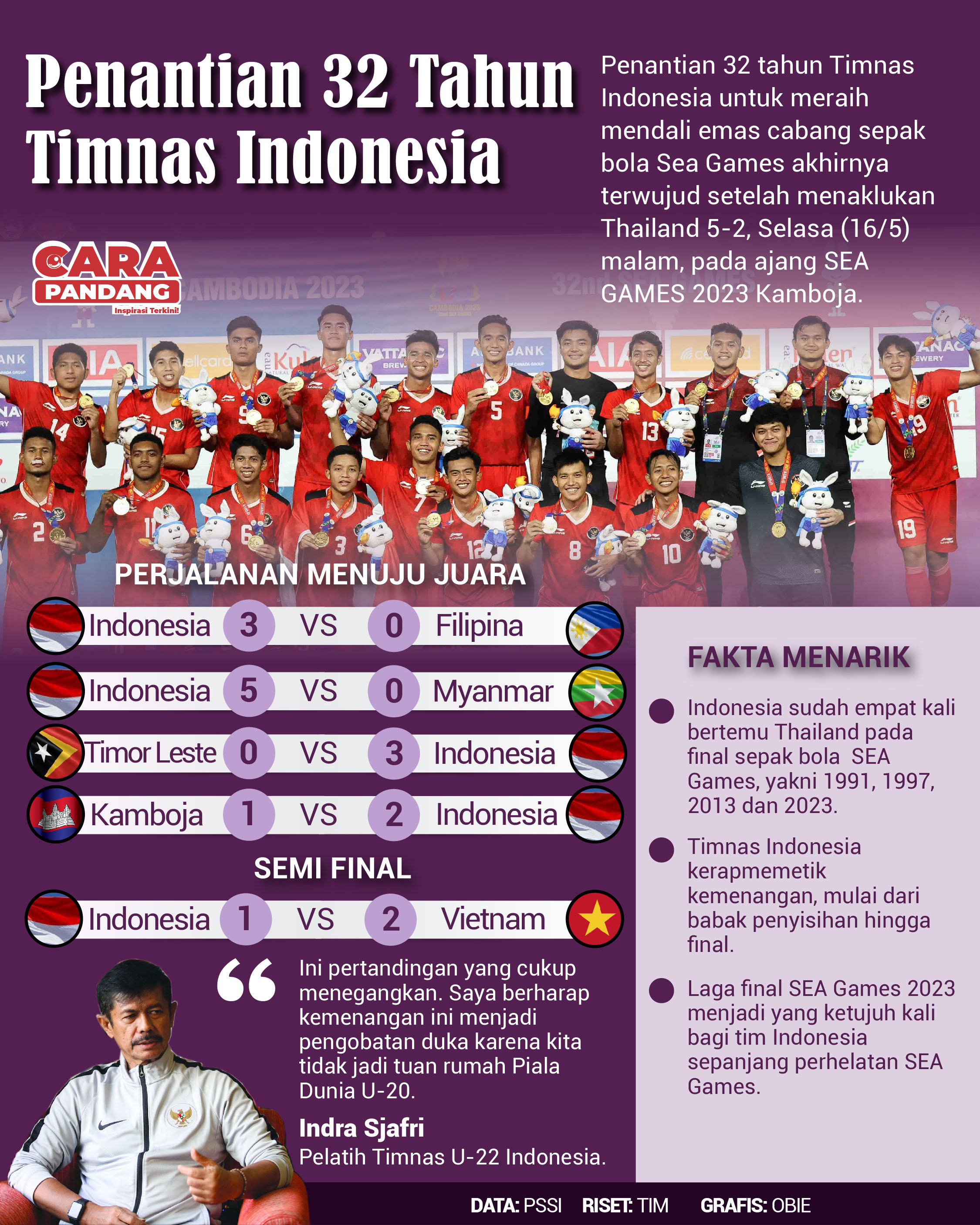 CARAPANDANG - Penantian 32 tahun Timnas Indonesia untuk meraih mendali emas cabang sepak bola Sea Games akhirnya terwujud setelah menaklukan Thailand 5-2, Selasa (16/5) malam, pada ajang SEA GAMES 2023 Kamboja