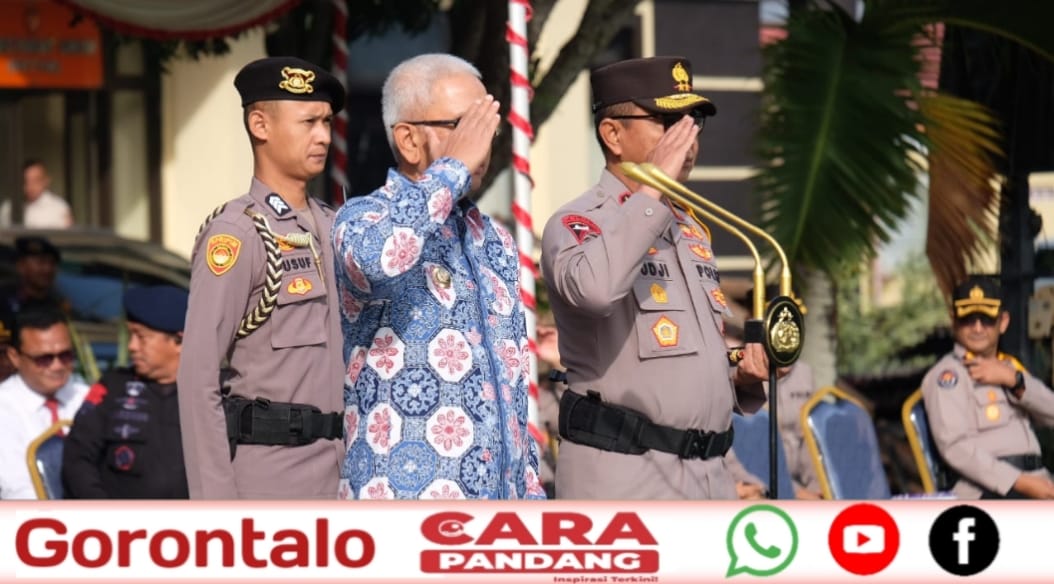 POHUWATO, CARAPANDANG - Polda Gorontalo, Pj Gorontalo Rudy Salahuddin bersama Kapolda Gorontalo Irjen Pol Drs. Pudji Prasetijanto Hadi MH., memimpin langsung Apel Gelar Pasukan Operasi Lilin jelang Natal dan Tahun Baru 2025. Acara ini berlangsung di Lapangan Apel Mapolda Gorontalo, Jum'at, (20/12/2024), dan dihadir Forkopimda Gorontalo, Danrem 133/NWB, Wakapolda Gorontalo, Pejabat Utama Polda Gorontalo dan jajaran.