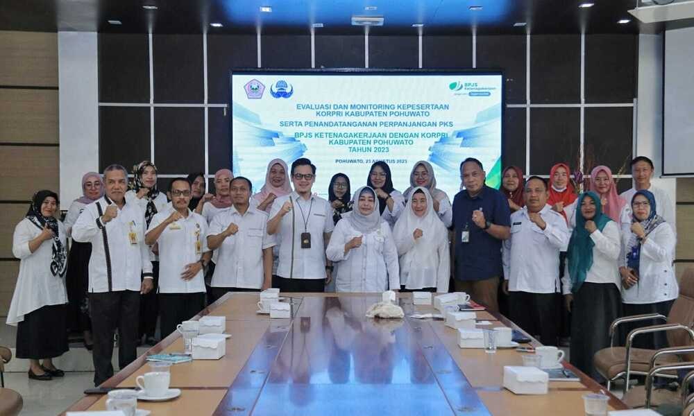 POHUWATO, CARAPANDANG.COM - Evaluasi monitoring kepesertaan Korpri serta penandatanganan perpanjangan Perjanjian Kerja Sama (PKS) antara BPJS Ketenagakerjaan dan Korpri Kabupaten Pohuwato tahun 2023 dihadiri Wakil Bupati Pohuwato, Suharsi Igirisa, Rabu, (23/8/2023).