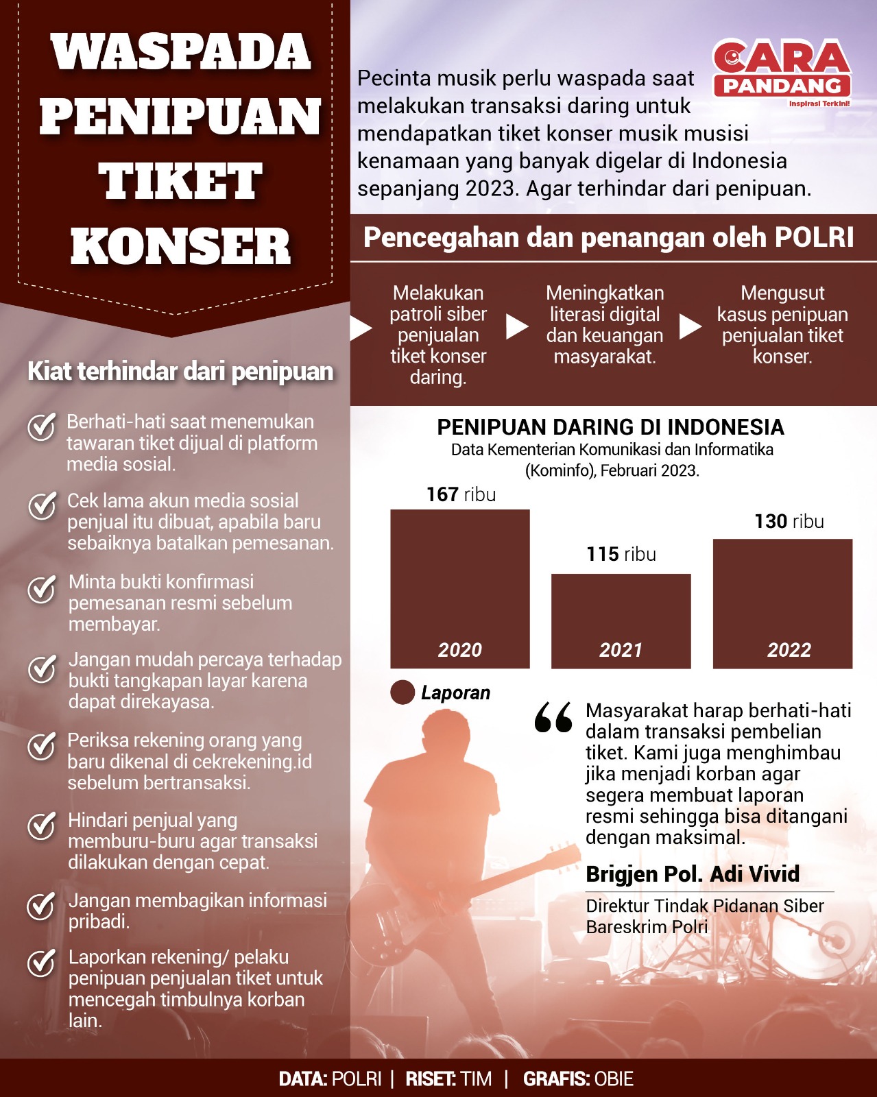 Pecinta musik perlu waspada saat melakukan transaksi daring untuk mendapatkan tiket konser musik musisi kenamaan yang banyak digelar di Indonesia sepanjang 2023.